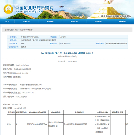 2020年巨鹿縣“電代煤”設(shè)備采購供應(yīng)商入圍項(xiàng)目